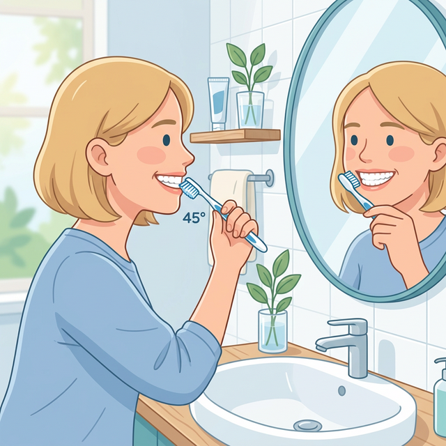 歯と歯茎の境目(歯頸部)に歯ブラシを45度の角度で当て、小刻みに動かしましょう。この角度で磨くことで、歯と歯茎の境界のプラークが効率よく除去できます。